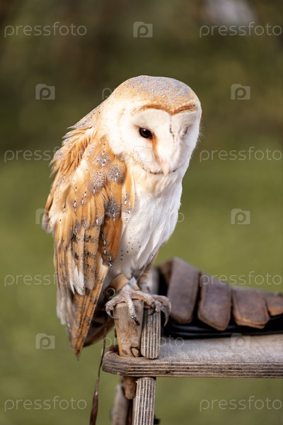 Сипуха сидит на деревянном столе