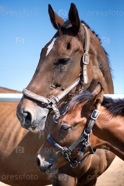 Крупный план кобылы с жеребенком в загоне на пастбище