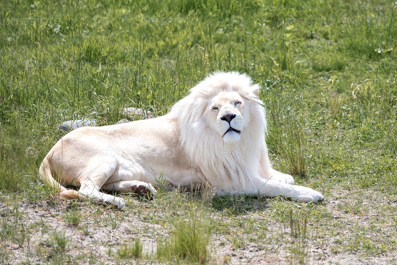Белый лев лежит на зеленой траве