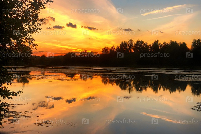 Волшебный августовский летний закат на лесном озере с солнечным светом, отраженным на поверхности воды