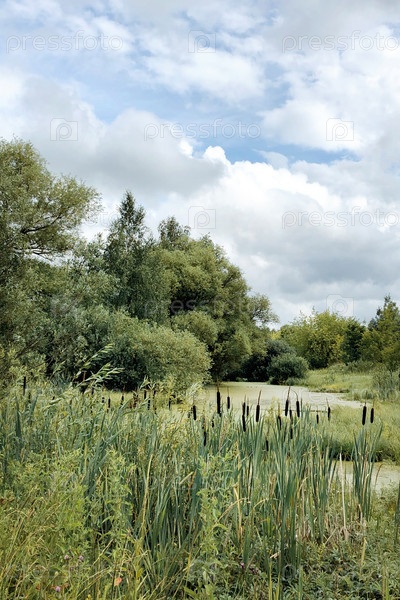 Летний день в деревне вдали от города на лесном озере с растущими на берегу ветками рогоза