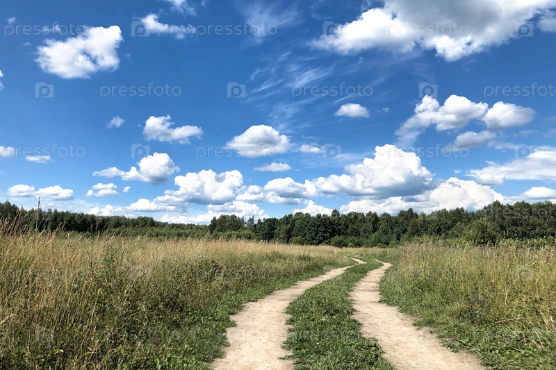 Извилистая проселочная дорога под голубым облачным небом