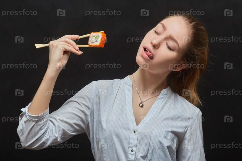 Девушка ест суши