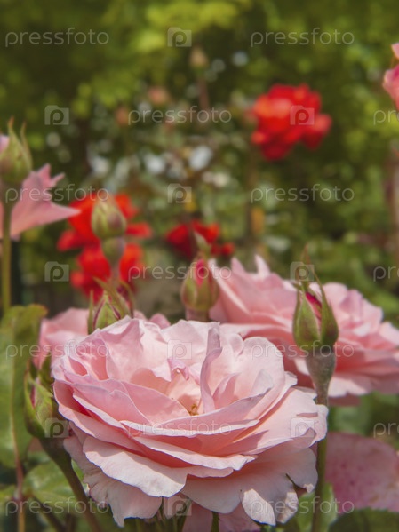 Розовые розы в цветущем летнем саду, мягкий фокус. Сказочные розовые розы в розарии