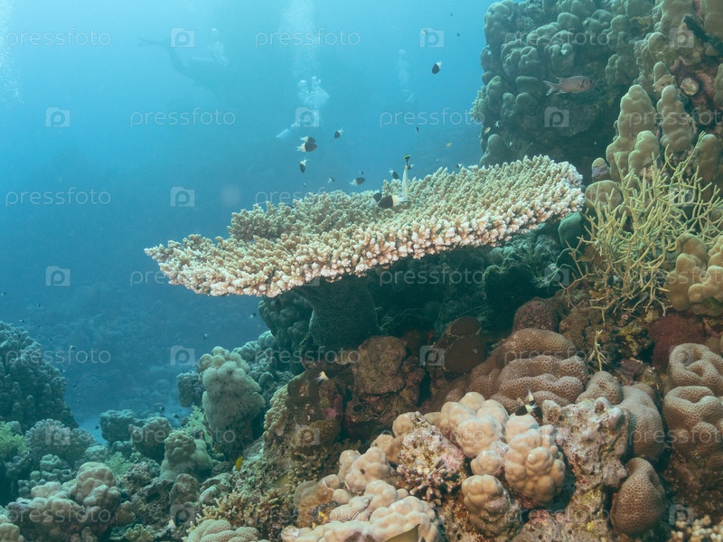 Красочные кораллы и маленькие экзотические рыбы на дне Красного моря в Египте