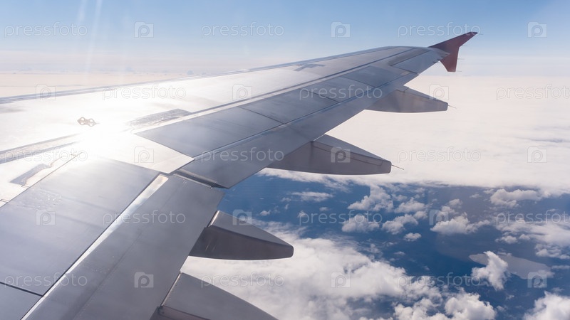 Вид на белые облака и Землю из иллюминатора самолета. Концепция путешествия