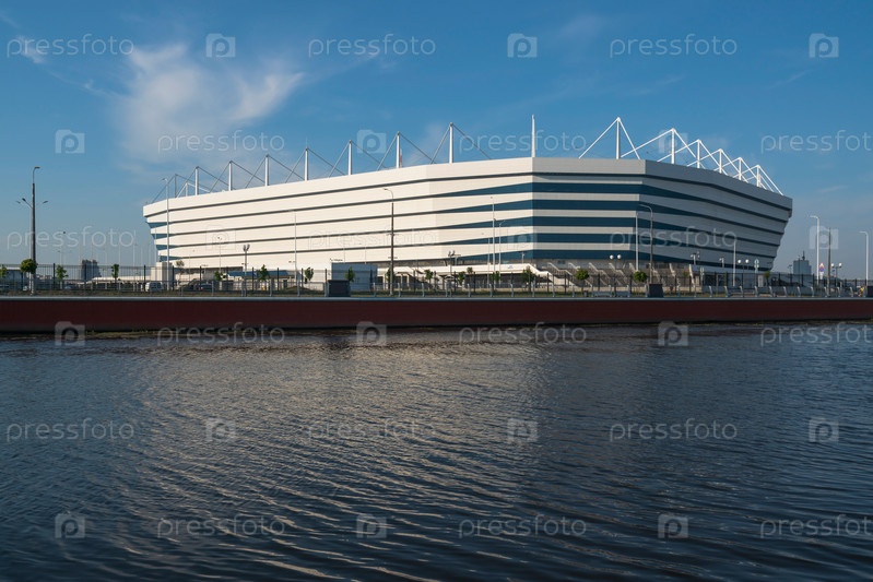 Калининград, Россия, 27.06.2022: Футбольный стадион для матчей чемпионата мира по футболу на берегу реки Преголя в солнечный летний день