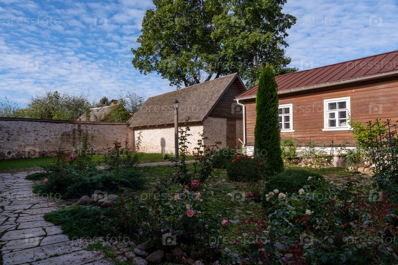 Вид на двор традиционной купеческой усадьбы на главной улице Изборска Печорская улица в летний пасмурный день, Изборск, Псковская область, Россия