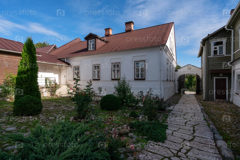 Вид на двор традиционной купеческой усадьбы на главной улице Изборска Печорская улица в летний пасмурный день, Изборск, Псковская область, Россия
