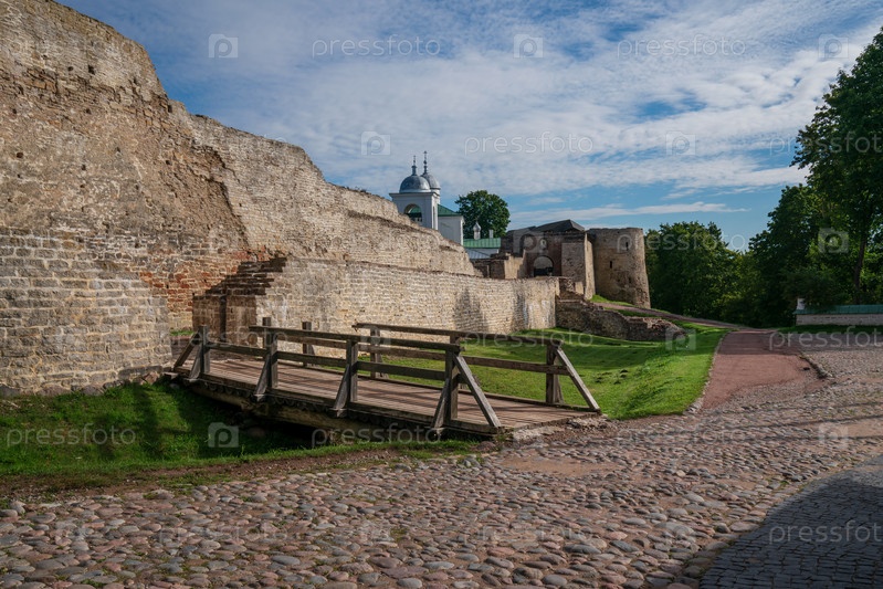 Вид на стену Изборской крепости, Никольских ворот и Никольского собора (XIV-XVII века) в солнечный летний день, Изборск, Псковская область, Россия