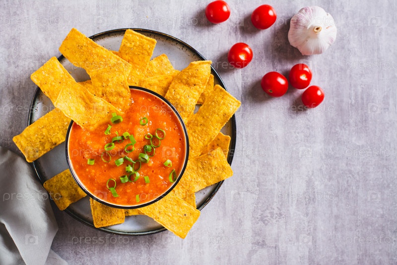 Традиционный мексиканский соус сальса в миске и кукурузные чипсы на тарелке сверху