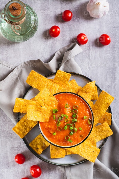 Чаша с мексиканской томатной сальсой и кукурузными чипсами на столешнице и вертикальный вид