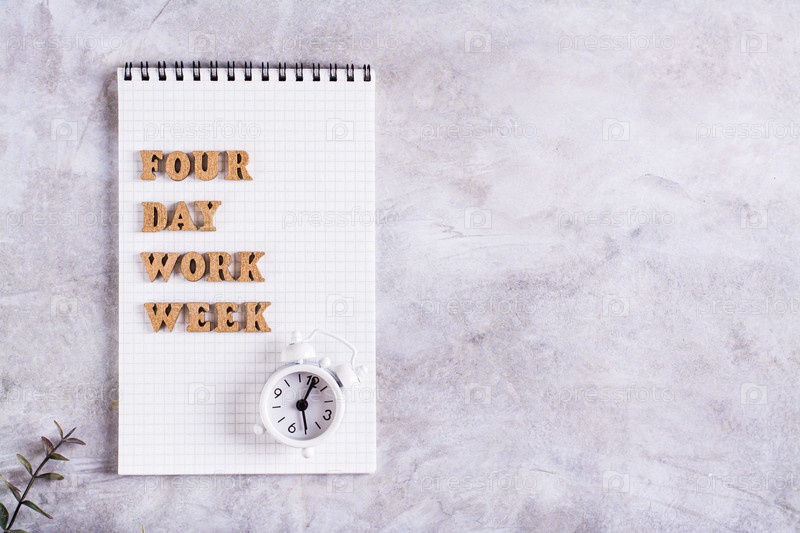 Концепция четырехдневной рабочей недели деревянные буквы на блокноте и вид сверху будильника