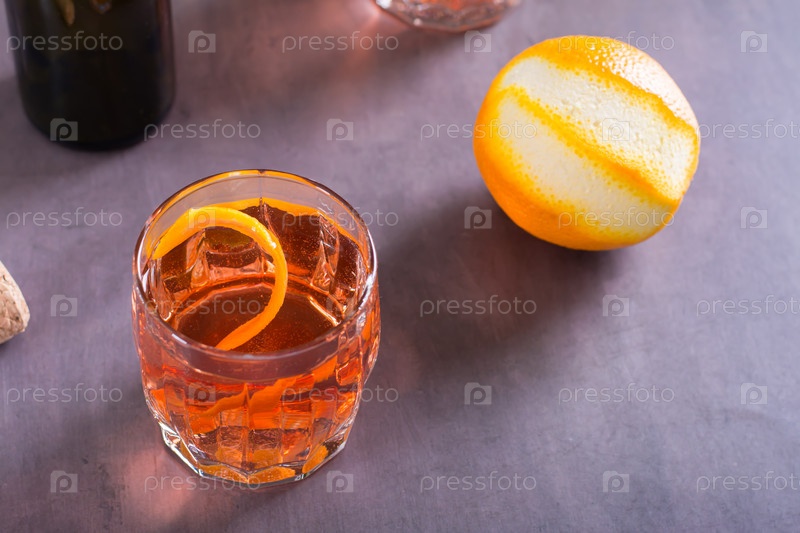 Холодный коктейль Negroni Sbagliato с ликером, вермутом и апельсином в стаканах на столе