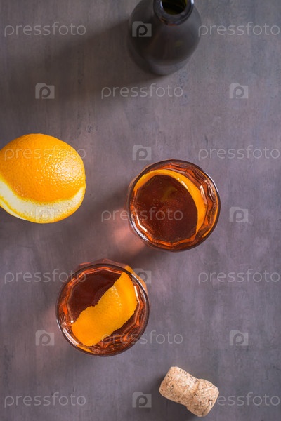 Холодный коктейль Negroni Sbagliato с ликером, вермутом и апельсином в бокалах сверху и по вертикали