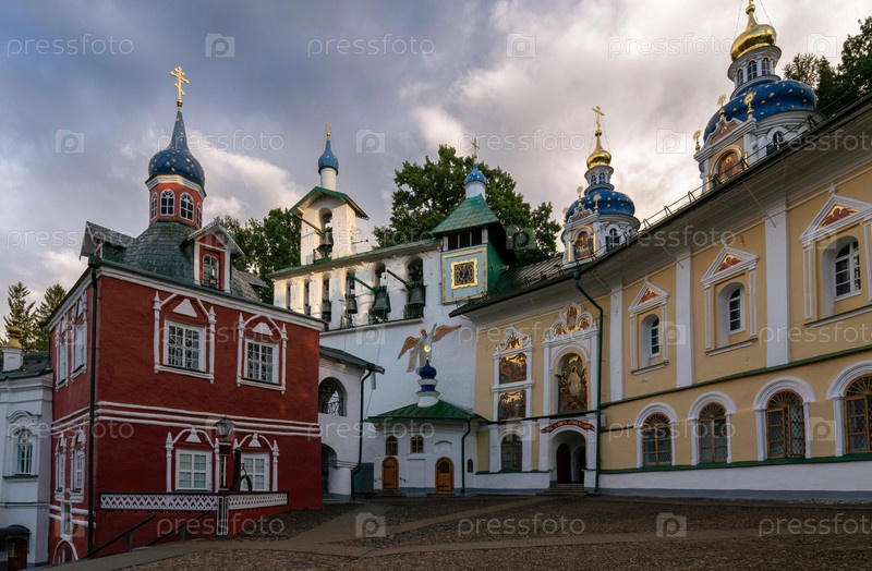 Надпись: «Вход в пещеры, построенные Богом». Вид на Успенский собор, Большую колокольню и ризницу Свято-Успенского Псково-Печерского монастыря, Печоры, Псковская область, Россия