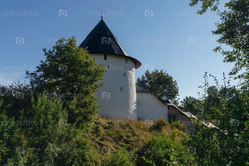 Вид на Тайловскую башню Свято-Успенского Псково-Печерского монастыря в солнечный летний день, Печоры, Псковская область, Россия