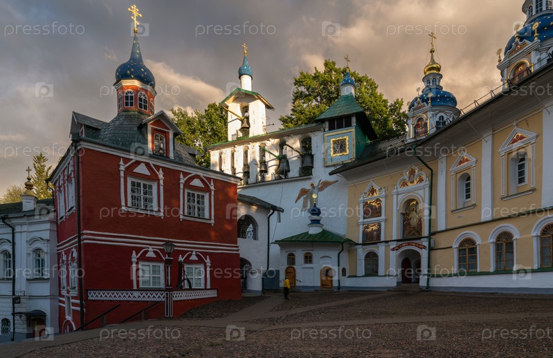 Надпись: «Вход в пещеры, построенные Богом». Вид на Успенский собор, Большую колокольню и ризницу Свято-Успенского Псково-Печерского монастыря, Печоры, Псковская область, Россия