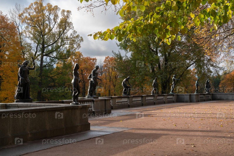 Вид на гранитную террасу со статуями в Екатерининском парке в Царском Селе в солнечный осенний день, Пушкин, Санкт-Петербург, Россия