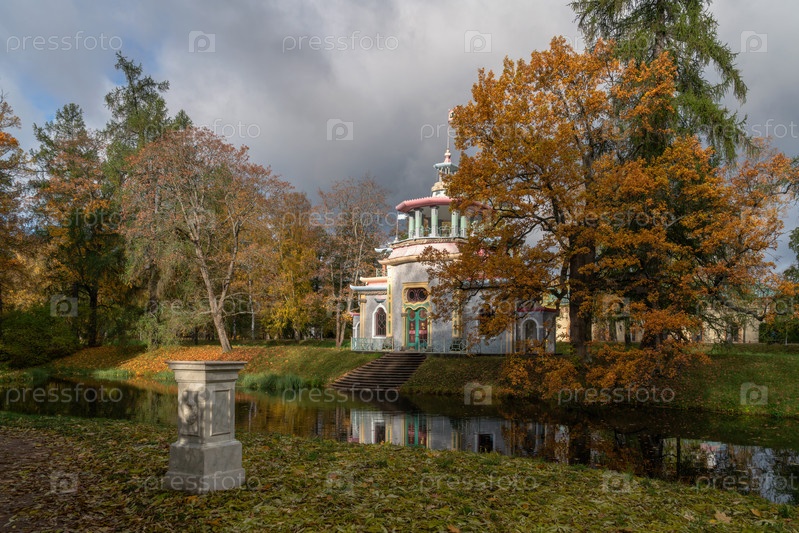 Перевод надписи на двери "Добро пожаловать". Китайская беседка на берегу Верхних прудов в Екатерининском парке в Царском Селе в солнечный осенний день, Пушкин, Санкт-Петербург, Россия