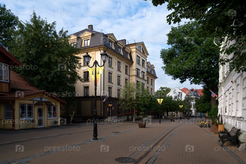Зеленоградск, Калининградская область, Россия, 08.07.2022: Вид на туристическую улицу в историческом центре курорта Балтийского моря Зеленоградск - Курортный проспект летним утром