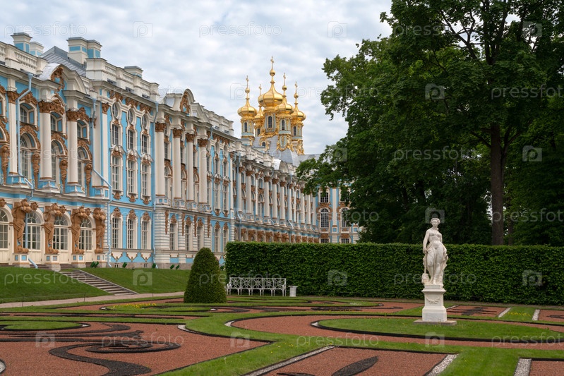 Пушкин, Санкт-Петербург, Россия, 06.12.2022: Вид на Екатерининский дворец и дворцовую церковь в Екатерининском парке в Царском Селе в солнечный летний день