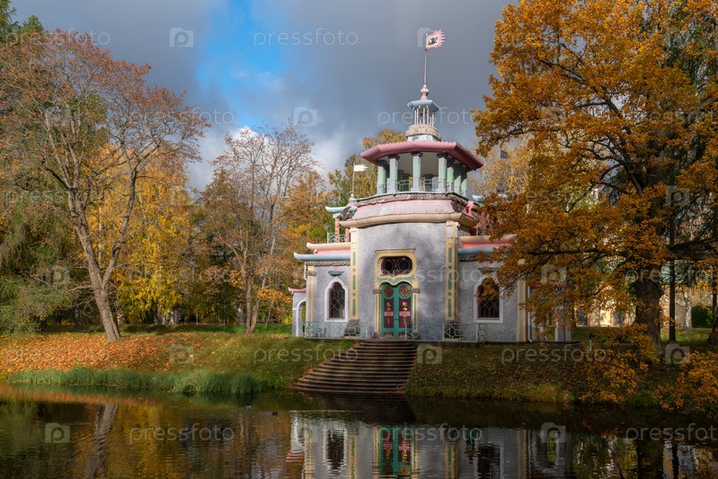 Перевод надписи на двери "Добро пожаловать". Китайская беседка на берегу Верхних прудов в Екатерининском парке в Царском Селе в солнечный осенний день, Пушкин, Санкт-Петербург, Россия