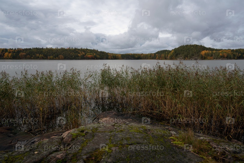 Вид на Ладожское озеро у поселка Лумиваара в пасмурный осенний день, Ладожские шхеры, Республика Карелия, Россия