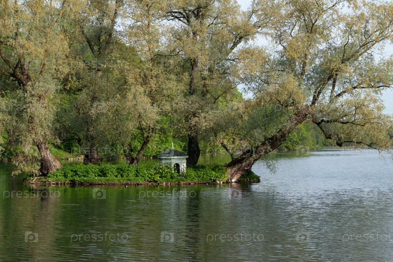 Небольшой остров на Белом озере с домиком для лебедей на территории Гатчинского дворцово-паркового комплекса в солнечный летний день, Гатчина, Санкт-Петербург, Россия