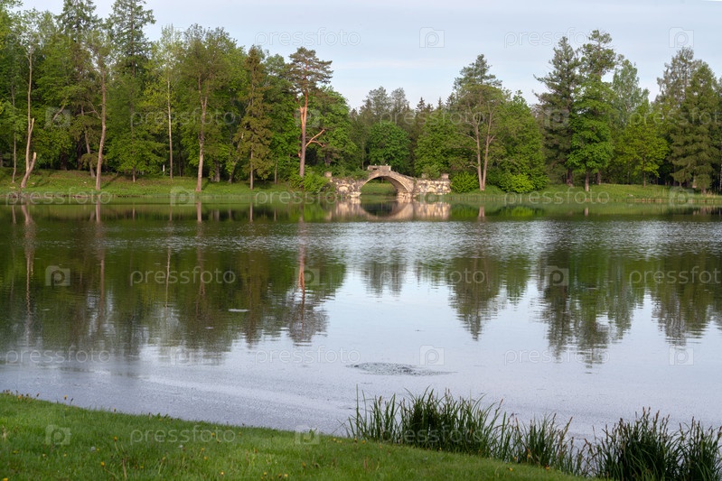 Горбатый мост через Белое озеро в Гатчинском парке в солнечный летний день, Гатчина, Ленинградская область, Россия