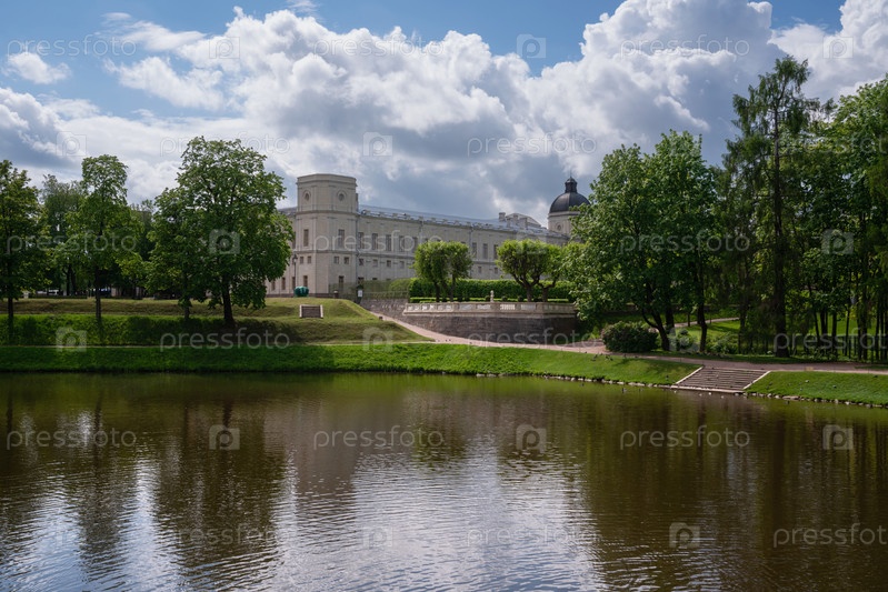 Дворцово-парковый ансамбль Гатчинского парка: Карпин пруд, Гатчинский дворец, частный дворцовый сад в солнечный летний день, Гатчина, Санкт-Петербург, Россия