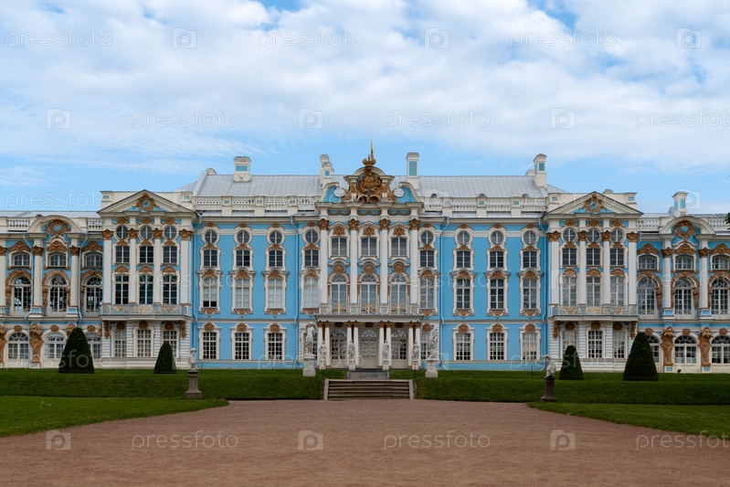 Пушкин, Санкт-Петербург, Россия, 06.12.2022: Вид на Екатерининский дворец в Екатерининском парке Царского Села в солнечный летний день