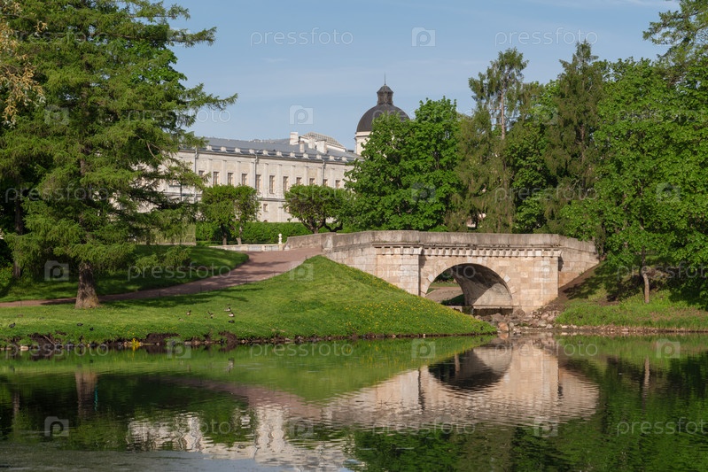 Вид на Карпин мост через каскад между Карпинским прудом и Белым озером Гатчинского парка и Гатчинский дворец на заднем плане в солнечный летний день, Гатчина, Санкт-Петербург Россия