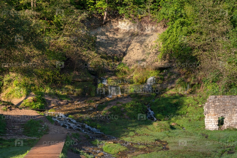Вид на словенские ручьи (ручьи Двенадцати апостолов) в Изборско-Мальской долине солнечным летним утром, Изборск, Печерский район, Псковская область, Россия