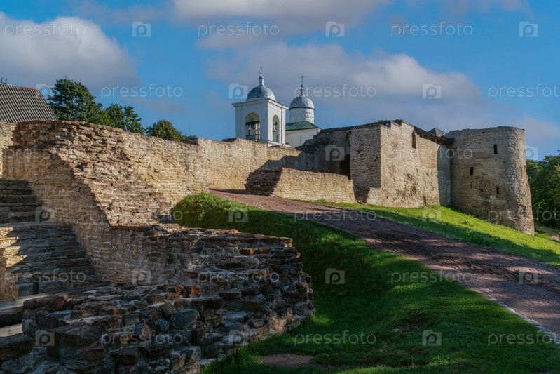 Вид на стену Изборской крепости, Никольских ворот и Никольского собора (XIV-XVII века) в солнечный летний день, Изборск, Псковская область, Россия
