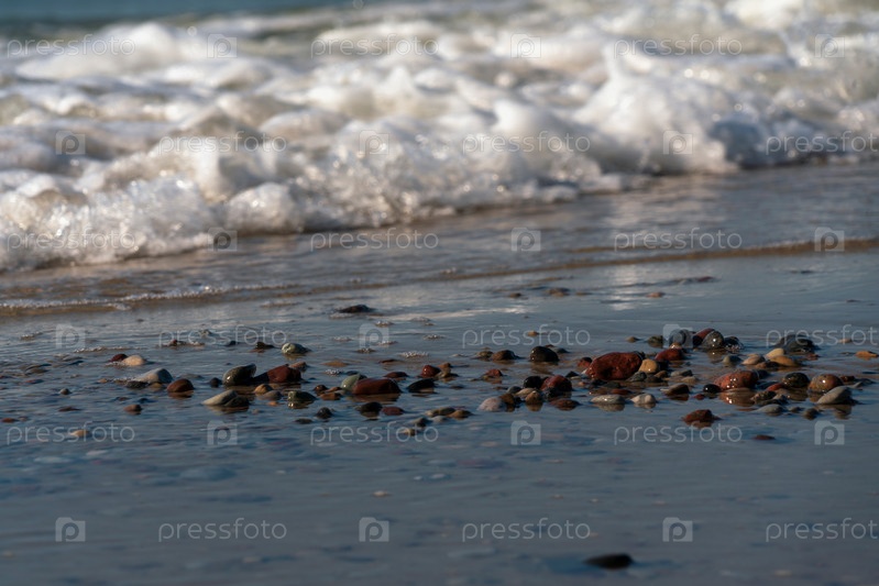Красочные морские камешки на берегу Балтийского моря на фоне набегающей волны, Куршская коса, Калининградская область, Россия