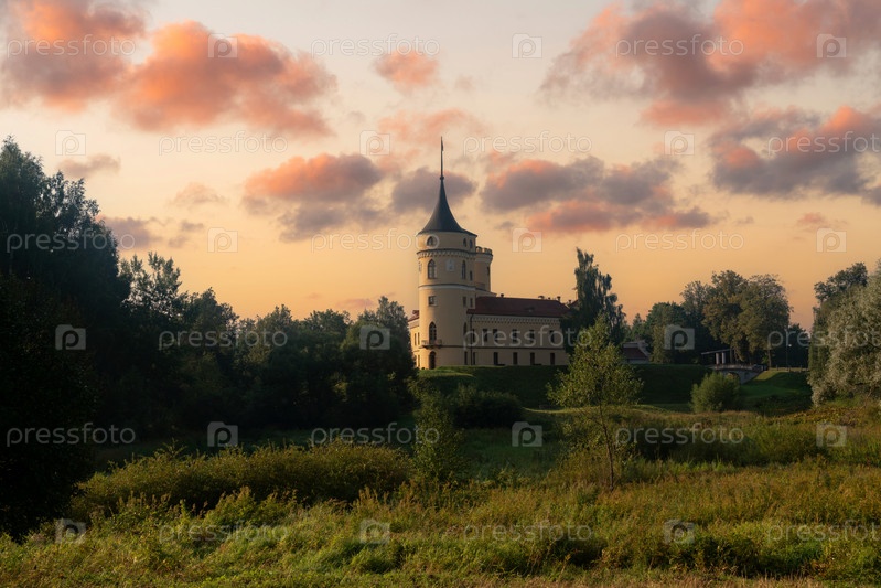 Вид на замок российского императора Павла I-Мариенталя (крепость БИП) с реки Славянка солнечным летним утром, Павловск, Санкт-Петербург, Россия