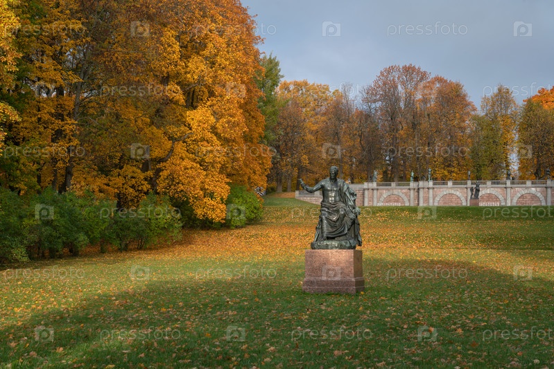 Вид на скульптуру Императора Нервов перед гранитной террасой со статуями в Екатерининском парке в Царском Селе в солнечный осенний день, Пушкин, Санкт-Петербург, Россия