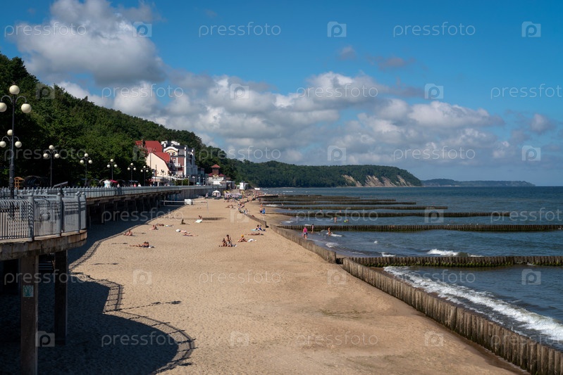 Светлогорск, Калининградская область, Россия, 07.03.2022: Вид на набережную вдоль побережья Балтийского моря и городской пляж в солнечный летний день