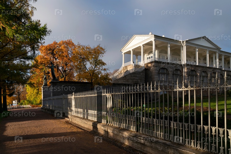 Пушкин, Санкт-Петербург, Россия, 10.09.2022: Вид на Камероновскую галерею в Екатерининском парке в Царском Селе в солнечный осенний день