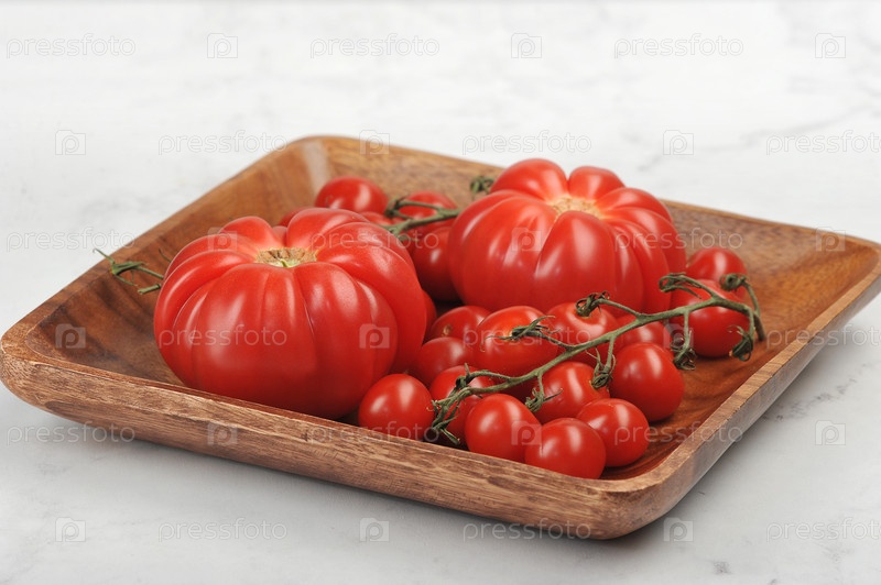 Спелые сочные красные помидоры в деревянной тарелке