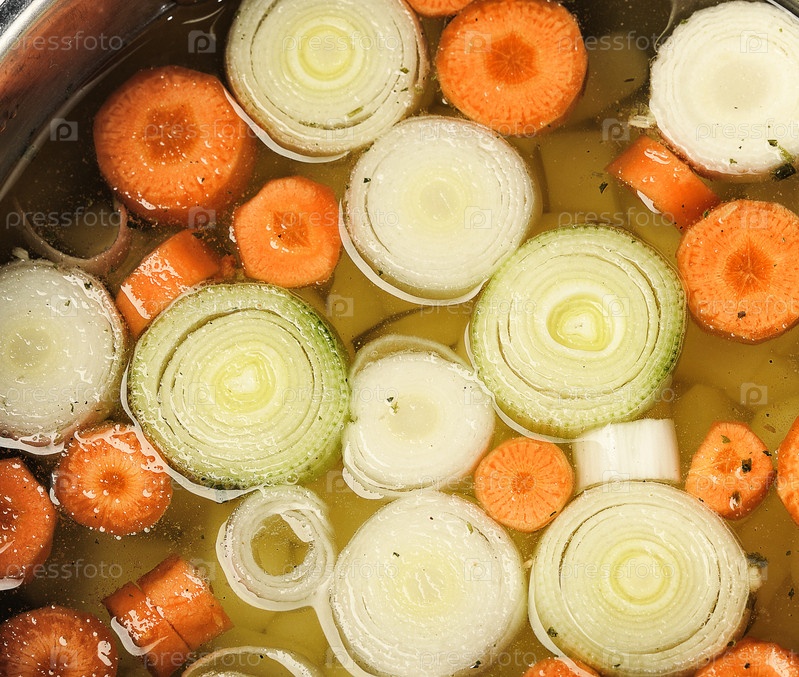 Кольца лука и ломтики моркови в кастрюле