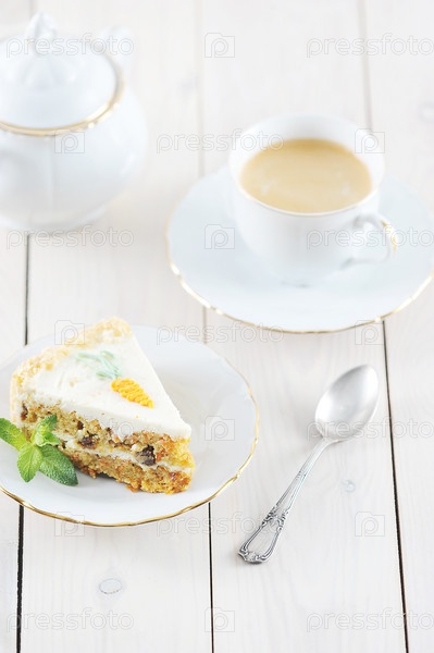 Кусочек морковного пирога с мятой и кофе