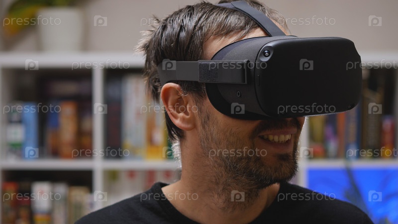 Мужчина с бородой в очках виртуальной реальности улыбается виртуальному миру, который он видит. Крупный план. На заднем плане игральная полка. VR-шлем для развлечений, обучения и игр