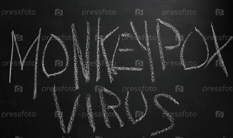 Слово вирус обезьяньей оспы написано белым мелом на черной доске. Крупный план. В мире вспышка обезьяньей оспы. Новая глобальная эпидемия