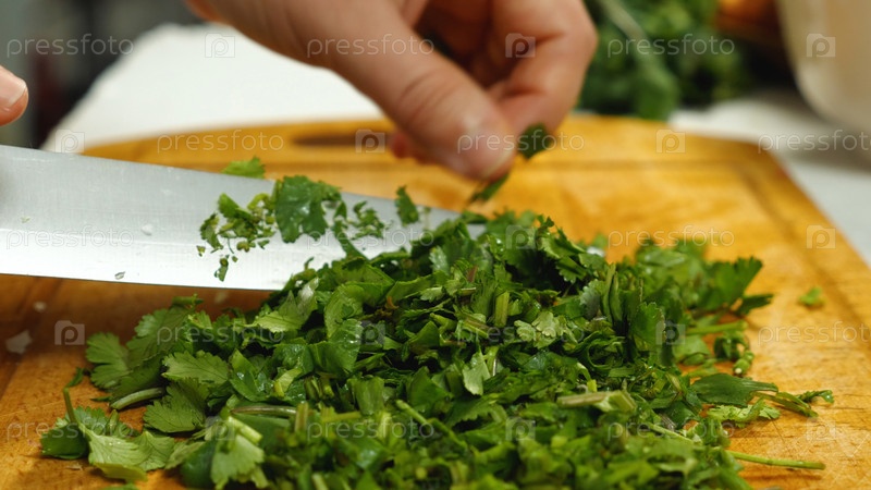 Повар режет петрушку острым ножом на кухонной доске. Вид сбоку. Вегетарианская кухня. Концепция вкусной и здоровой пищи. Крупный план