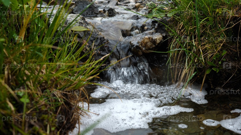 Ясный поток воды, протекающей между скалами в горах. Вода пузырится и пенится, падая с небольшой высоты. Зеленая трава растет на заднем плане. Красота природы