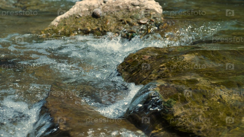 Крупный план чистого потока горной реки. Вода течет между скалами, покрытыми зеленым мхом. Миролюбие