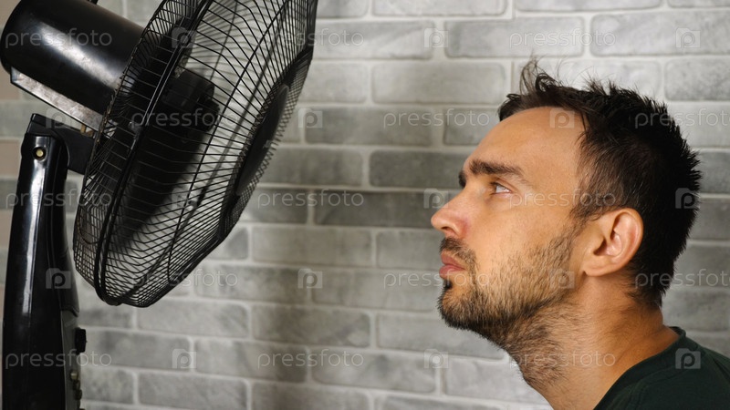 Крупный план бородатого мужчины, сидящего перед электрическим вентилятором. На заднем плане светлая каменная стена. Мужчина спасается от летней жары