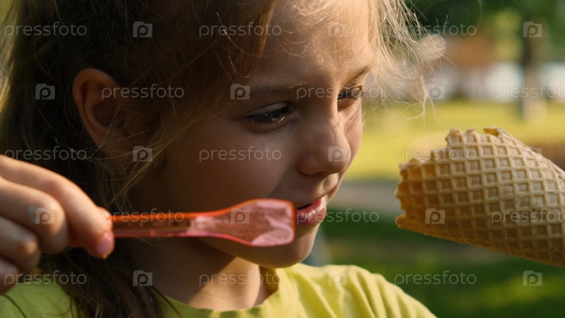 Крупный план красивой девушки, которая ест мороженое из чашки ложкой. Ребенок с мороженым в городском парке. Беззаботное счастливое детство
